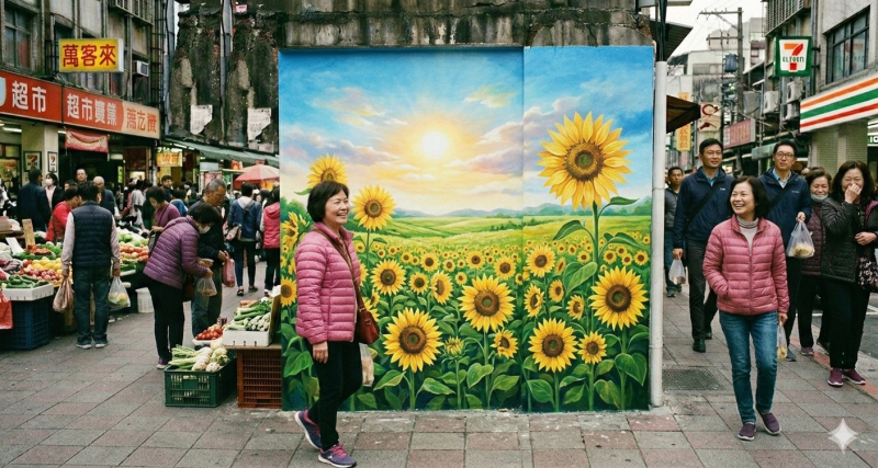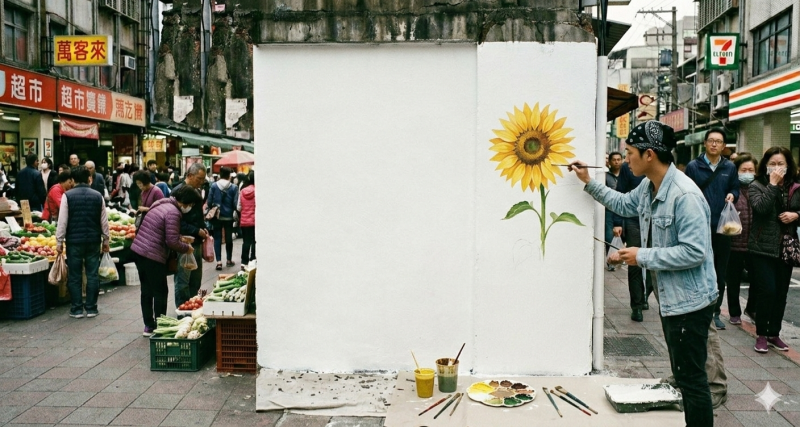 奇蹟開始發生,這塊清爽的「純白」在灰暗的巷弄中顯得格外耀眼,它向路人傳遞了一個訊息:這裡是可以被改變的。意外激發了一位大學生的創作慾望,他在牆上畫下了一朵燦爛的向日葵。